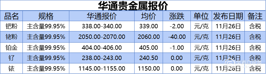 华通白银网 11月26日讯:钯粉、铑粉、铂金、钌、铱报价