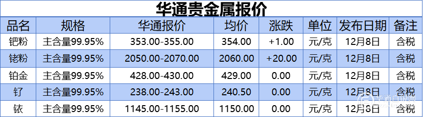 华通白银网 12月8日讯:钯粉、铑粉、铂金、钌、铱报价