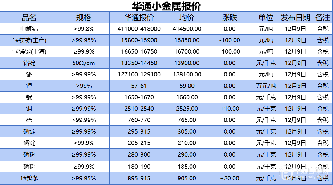 华通白银网 12月9日讯:电解钴、1#镁锭(生产)、1#镁锭(上海)、锗锭、铋、锂、镓、铟、碲、硒锭(99.99%)、硒锭(99.9%)、硒粉、硒粉(99.9%)、1#钨条报价