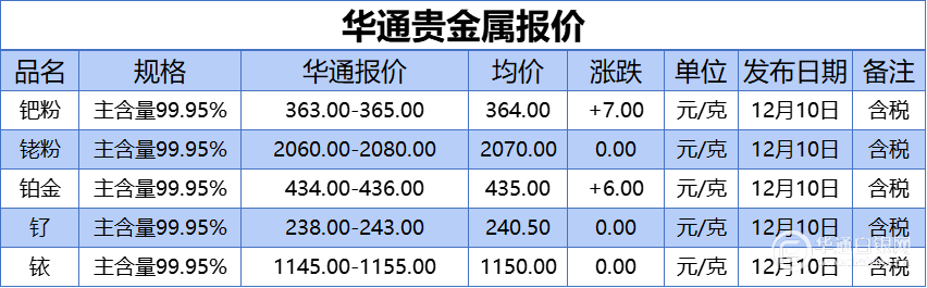 华通白银网 12月10日讯:钯粉、铑粉、铂金、钌、铱报价