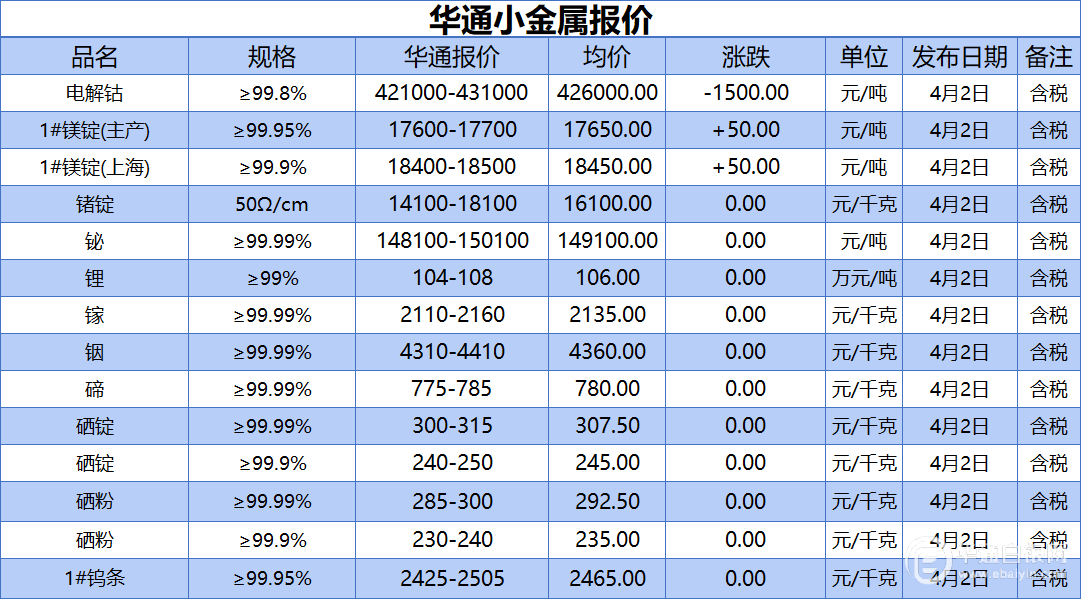 华通白银网 4月2日讯:电解钴、1#镁锭(生产)、1#镁锭(上海)、锗锭、铋、锂、镓、铟、碲、硒锭(99.99%)、硒锭(99.9%)、硒粉、硒粉(99.9%)、1#钨条报价