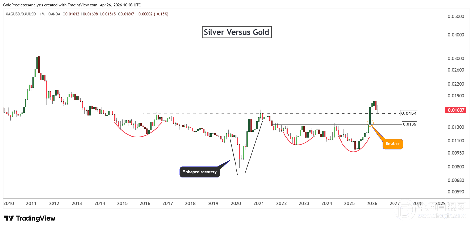 银金比在2025年12月突破0.0154,并开始大幅上涨,在2026年1月达到峰值。V形复苏的形成以及随后的看涨价格走势表明,白银未来可能会更加强劲。