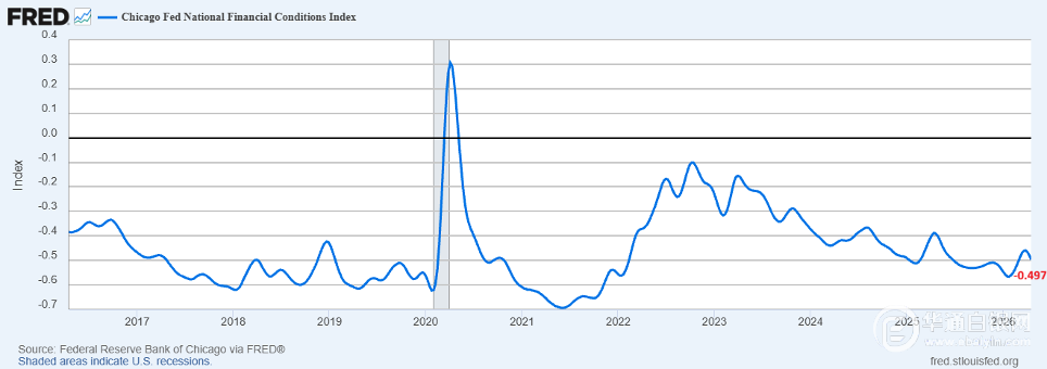 市场流动性有所改善。芝加哥联邦储备银行的全国金融状况指数为-0.497,这表明金融市场流动性有所提升。若该指数高于-0.40,则将表明避险情绪增强,并将证实联邦基金利率信号和密歇根大学当前经济状况指数所发出的看跌信号。