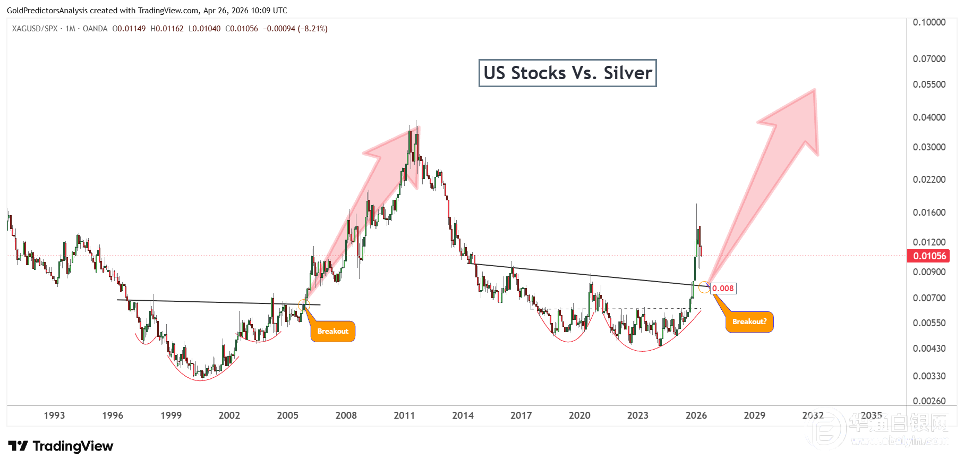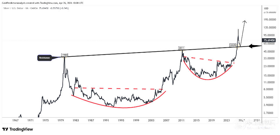 在2025年白银价格比率出现看涨形态之后出现的突破,引发了强劲的上涨,使得2011年白银价格达到了一个高点。如今,类似这种模式表明,未来几个月白银价格可能会更加强劲。